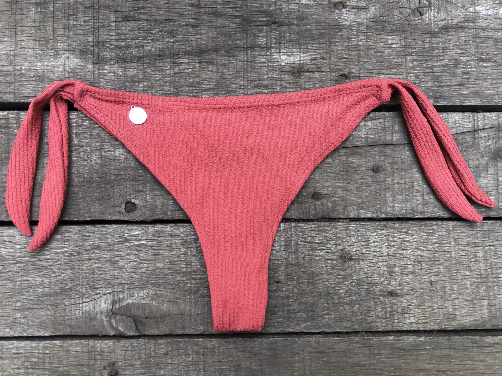 Descubre la Bombacha Colaless o Vedetina para atar en los costados. Confeccionada en lycra texturada color ladrillo, esta prenda es sinónimo de confort y estilo.